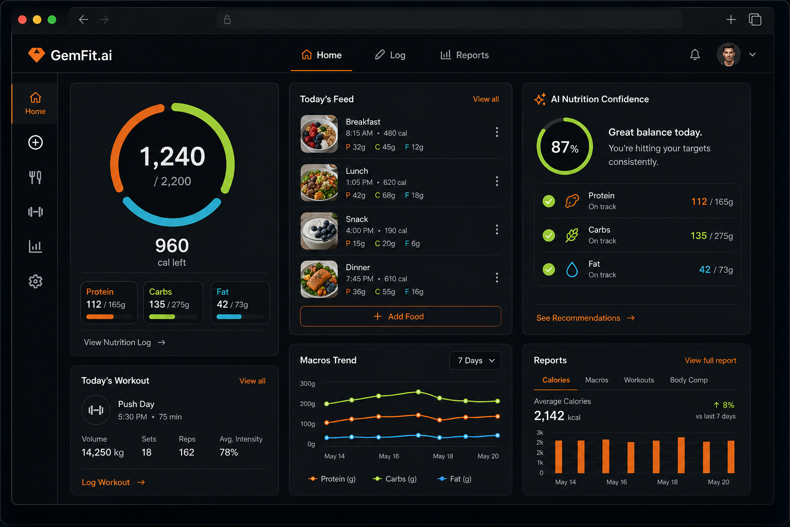 GemFit.ai turns workouts, calories, macros, consistency, and body metrics into progress reports that help users understand what is working.